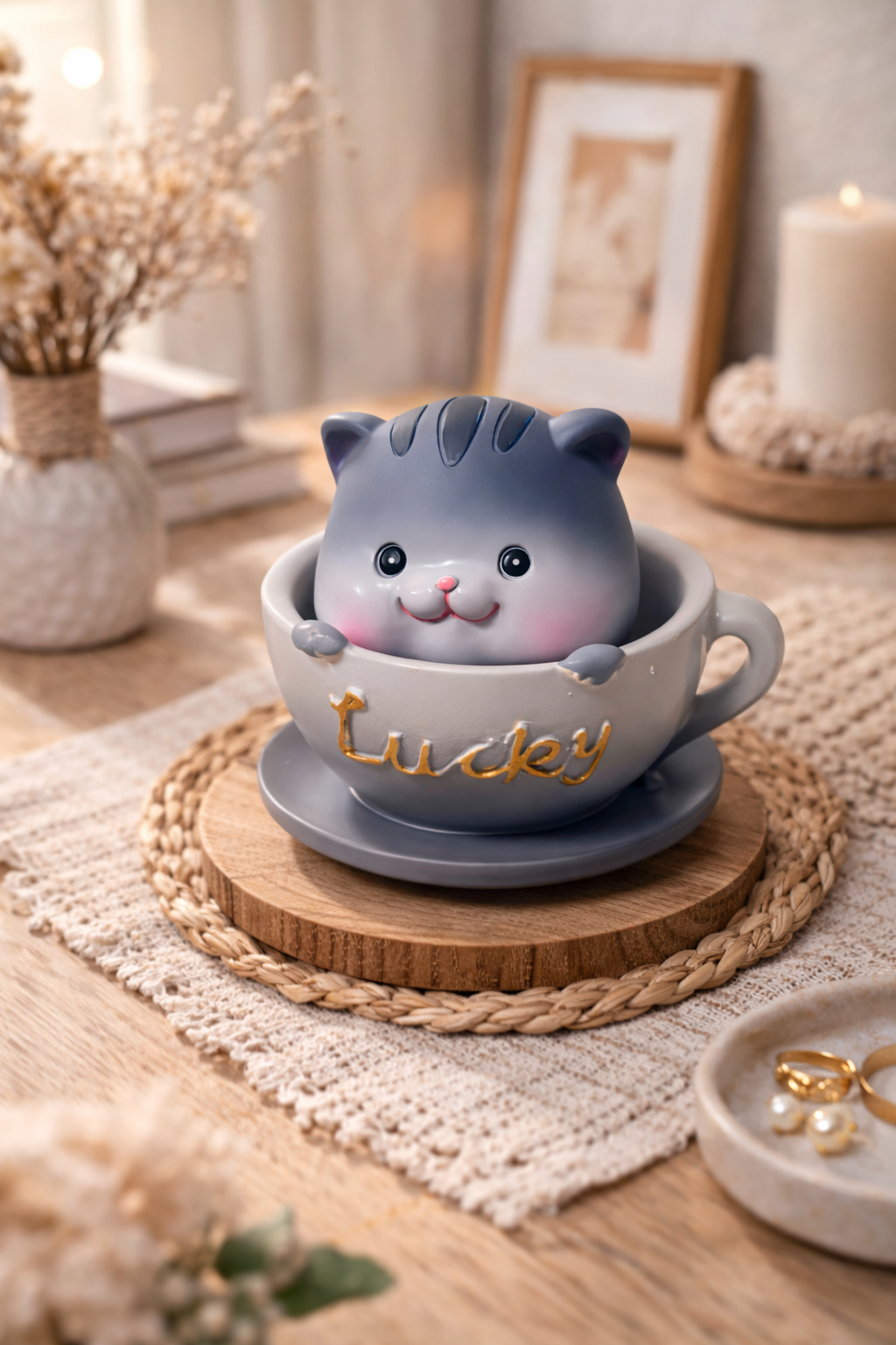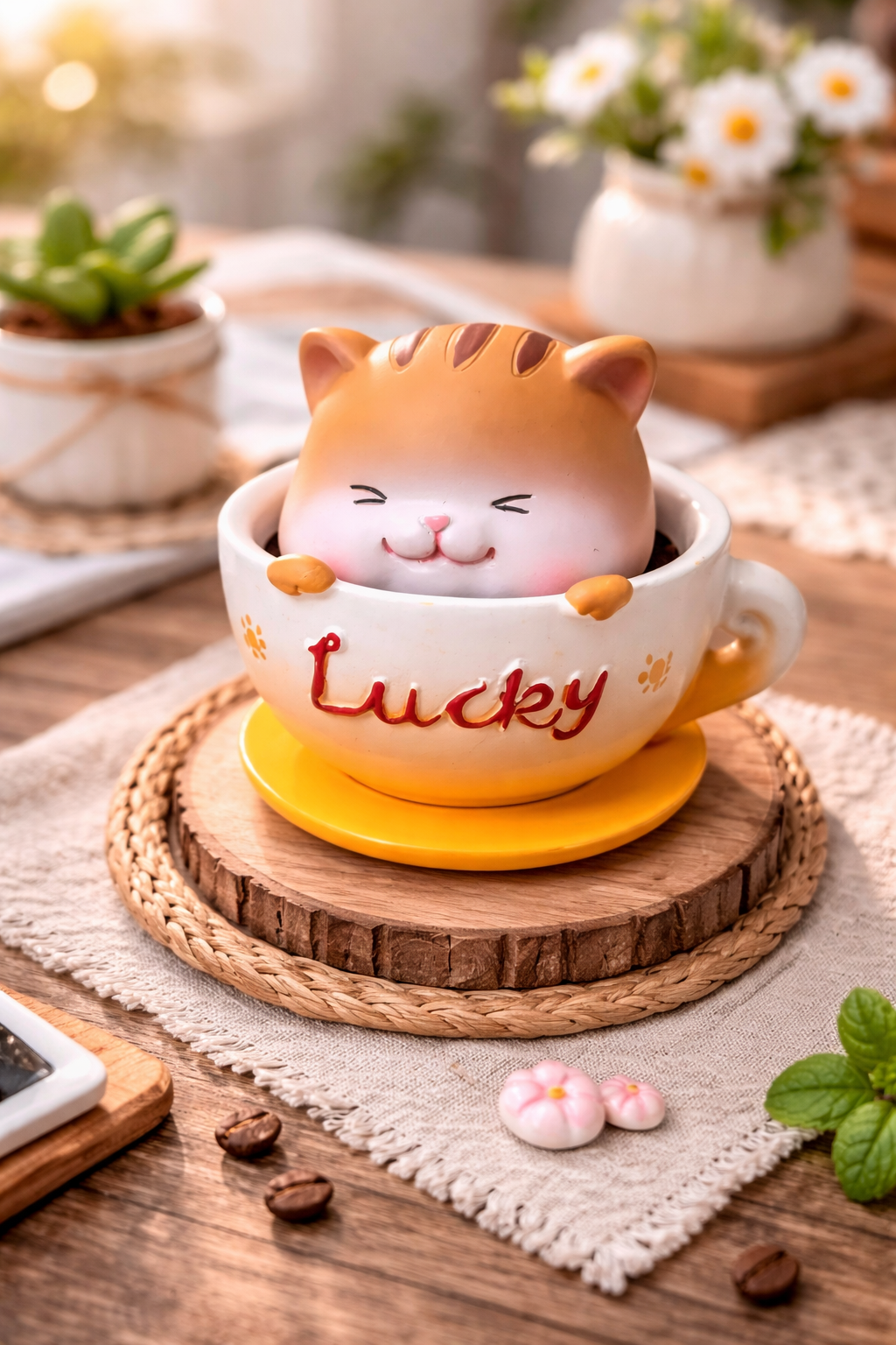 • Adorable lucky cat design – each mini cat sits inside a tiny cup with a cheerful smile, instantly adding a warm and happy vibe to any space
