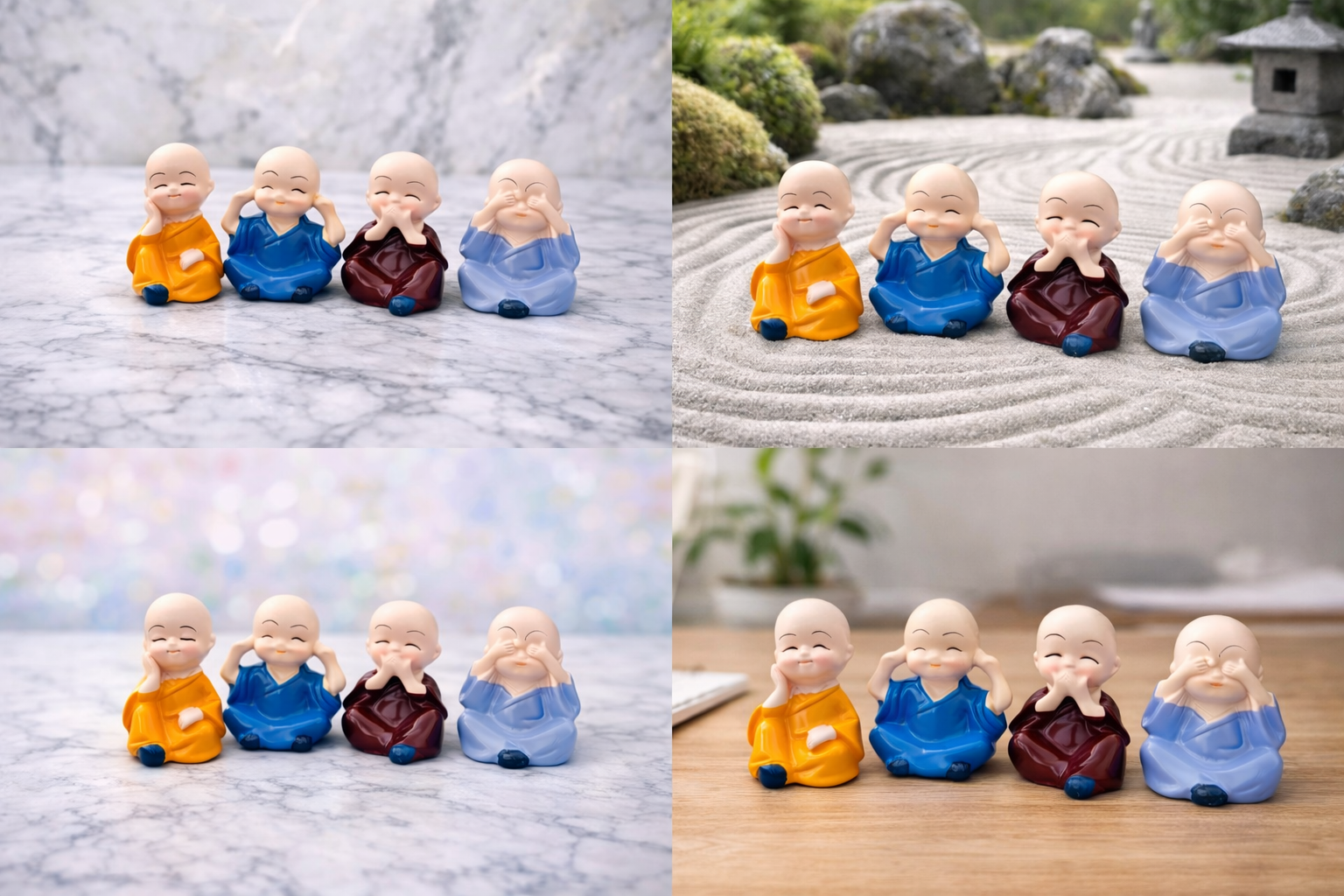 - Meaningful “No Evil” Concept – Set of 4 Buddha monks symbolizing See No Evil, Hear No Evil, Speak No Evil & Think No Evil